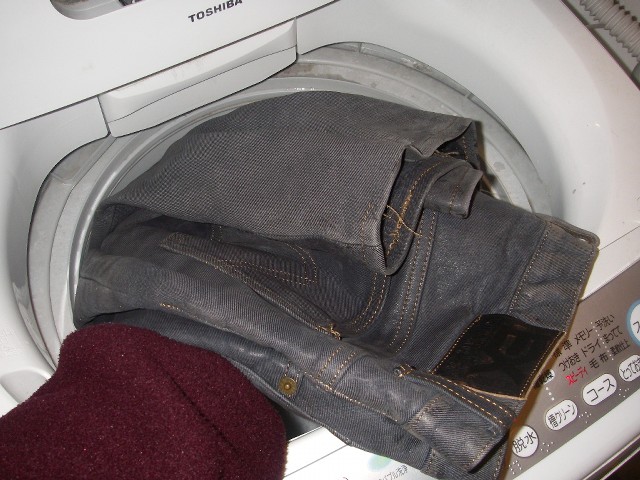 汚れてくたびれたカントリージーンズを洗濯機に投入です!