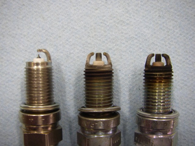 新品のプラグと取り外したプラグたち。左から新品→プライマリ→セカンダリ。純正は外側2極タイプですね。