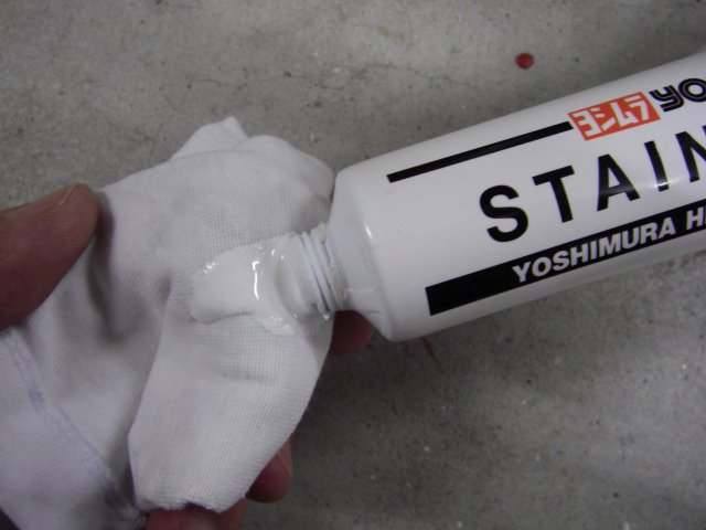 ステンマジック適量をウェスに取り、エキパイに塗り塗りしてからシコシコ磨きます。そんなに力を入れなくても見る見るうちに汚れが取れていきます。