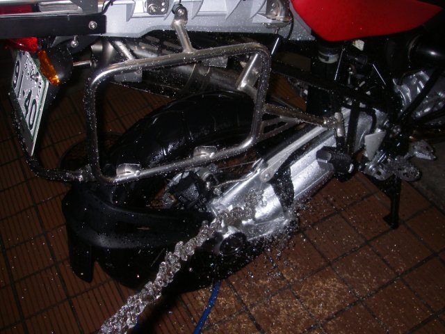 天橋立ツーリングから帰着後、R1200GSアドベンチャーをガレージに移動しようとしたとき、ふと目に付いたのがリアホイールに付着した白い粉のような汚れ。それはまるでイケナイ薬のよう。。。Ψ(`∀´)Ψウケケ